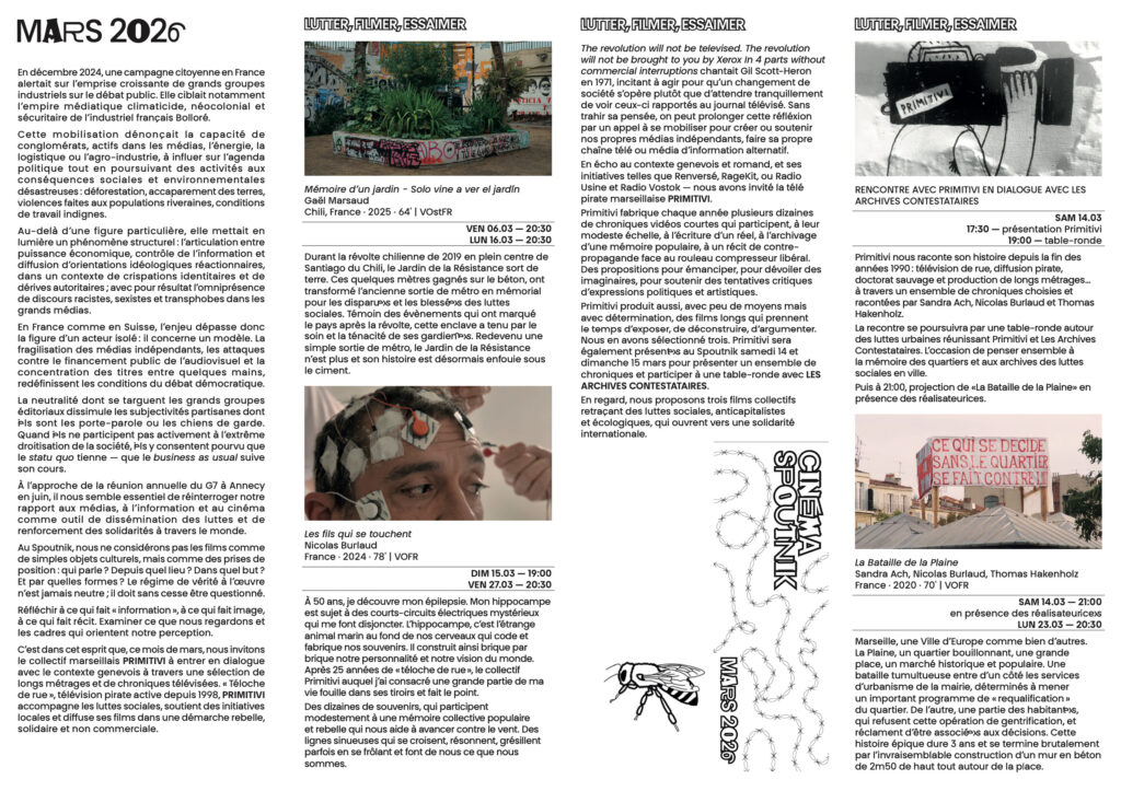 Ce mois de Mars, à l’approche de la réunion annuelle du G7 à Annecy en juin, Toute la programmation sera dédié à la réinterrogation de notre rapport aux médias, à l’information et au cinéma comme outil de dissémination des luttes et de renforcement des solidarités à travers le monde.
