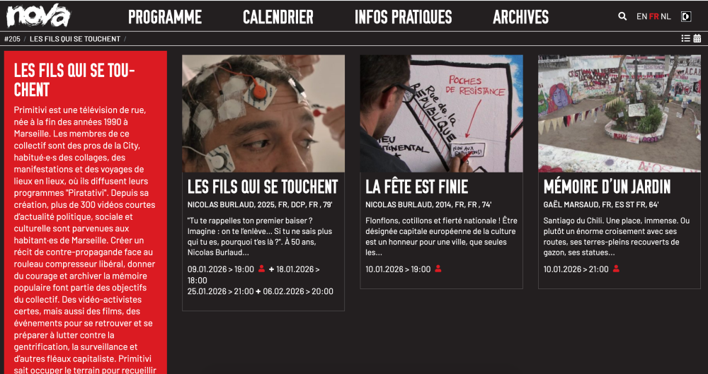 Les camarades de l’excellentissime et infatigable Cinéma Nova de Bruxelles ouvrent grand leurs portes à Primitivi en janvier : « Les fils qui se touchent » de N.Burlaud (le 9 avec le réal + 4 autres séances après), et « La fête est finie » de N. Burlaud, et « Mémoires d’un Jardin » de G. Marsaud le 10. Faites tourner